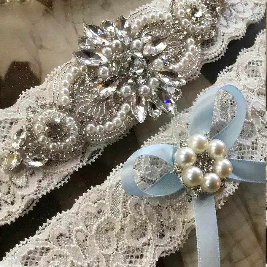 Hot Sale Bride Lace Wedding Garter Set Pearl Rhinestone Garter for Wedding with Blue Bow Wedding Accessories